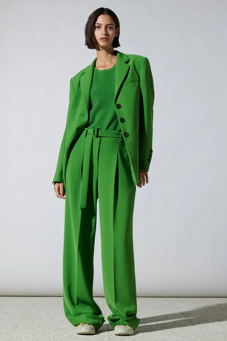 Groen oversized pak met wijde broek Luisa Cerano blazer € 475 en broek € 279