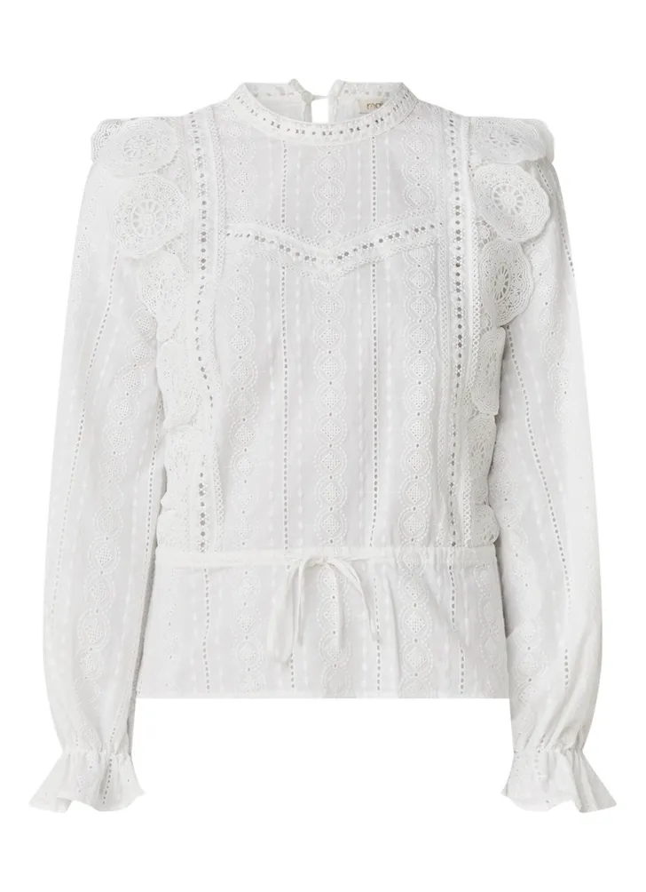 Op de foto draag ik een witte blouse met borduursels en ruches van Fabienne Chapot € 119,95