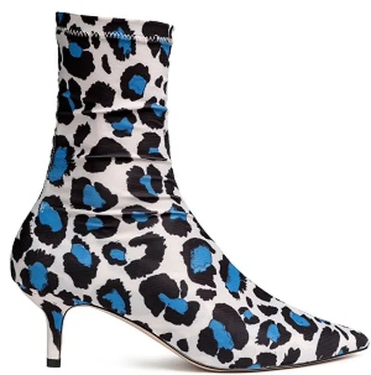 Soklaars met blauwe panterprint en kittenheel: H&M € 49,95