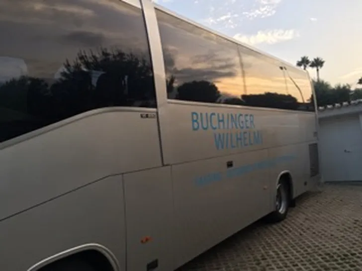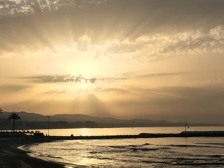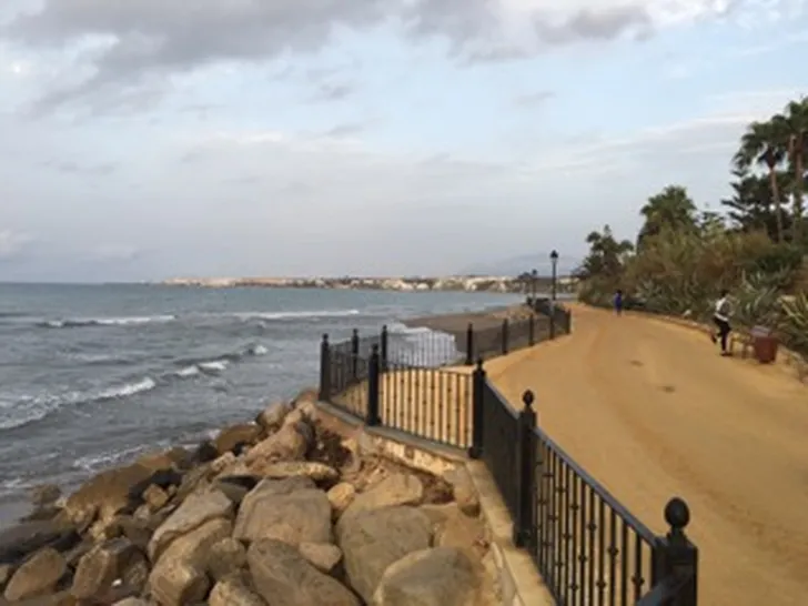 Buiten staat een enorme touringcar die ons naar het strand brengt. Je kunt zelf weten wat je daar gaat doen het komende uurtje. Lekker zwemmen of langs het strand lopen / rennen op een mooi geprepareerd pad waar veel joggers rennen. Ik zie ook een dame meteen een koffie tentje induiken. Foei !! In Italie viel het me op dat werkelijk iedereen aan de kust getatoeëerd is, hier valt me het aantal schoothondjes op. Stoere brede, maar ook kleine oude Spaanse mannen die met zo’n heel klein chihuahua-achtig hondje aan een diamanten riempje lopen. De meeste hondjes zijn wit en lijken op een Swiffer.