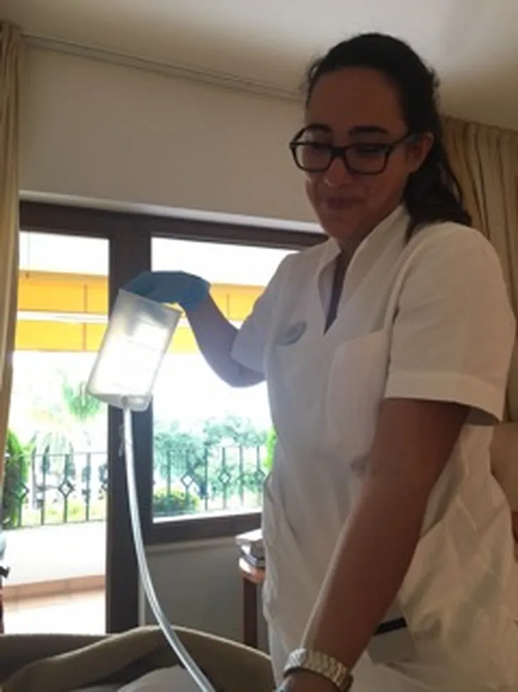 Direct na het strand, komt om 10.00 de verpleegster mijn kamer binnen met een plastic beker gevuld met 2 liter water. Ik krijg een angstig voorgevoel. Ze vraagt me op het bed te gaan liggen met mijn gezicht naar de muur. Dan brengt ze een slang met vaseline in. Ja waar gaat die slang in? Hoe leg ik dat het beste uit? Nou.. naar die plek die nooit het daglicht ziet. En zo vullen mijn darmen zich met 2 liter water. Ik moet 2 minuten blijven liggen en dan ren, nee sprint ik naar de wc. Alle overtollige ellende komt er uit. Mooi dat scheelt weer een paar onsjes. Deze enema (voelt als de enemy maar zo zie ik het niet) zoals ze dit noemen zal ik vanaf nu om de dag krijgen. Blik op oneindig. Het stelt eigenlijk weinig voor maar ik heb wel medelijden met de verpleegster. Zij vertelde me later dat er ook mensen zijn die zelf zo’n slang inbrengen en tegelijk die kan met water omhoog houden. Knap. Ik hoor graag wie dit kan.