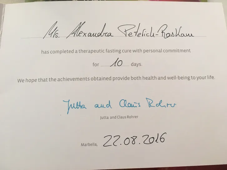 S’avond ga ik naar het restaurant en krijg gelukkig een leuk tafeltje buiten. Het eerste uur zit ik er alleen. Ik kijk naar het geroezemoes om me heen en zie dat de meesten tafels bezet zijn door stellen of groepjes mensen. Ze hebben het allemaal gezellig zo met hun glaasje water. Ik heb een diploma voor me liggen waar de directie mij feliciteert met mijn 10 dagen vasten. Vanaf nu zal ik 3 x per dag in het restaurant gaan eten met 800 calorieën op een dag. Christina uit Madrid komt om 21u naast me zitten ( dat is het tijdstip waarop de Spanjaarden gaan eten). En mijn vriendin Soraya. Het wordt opeens heel gezellig.