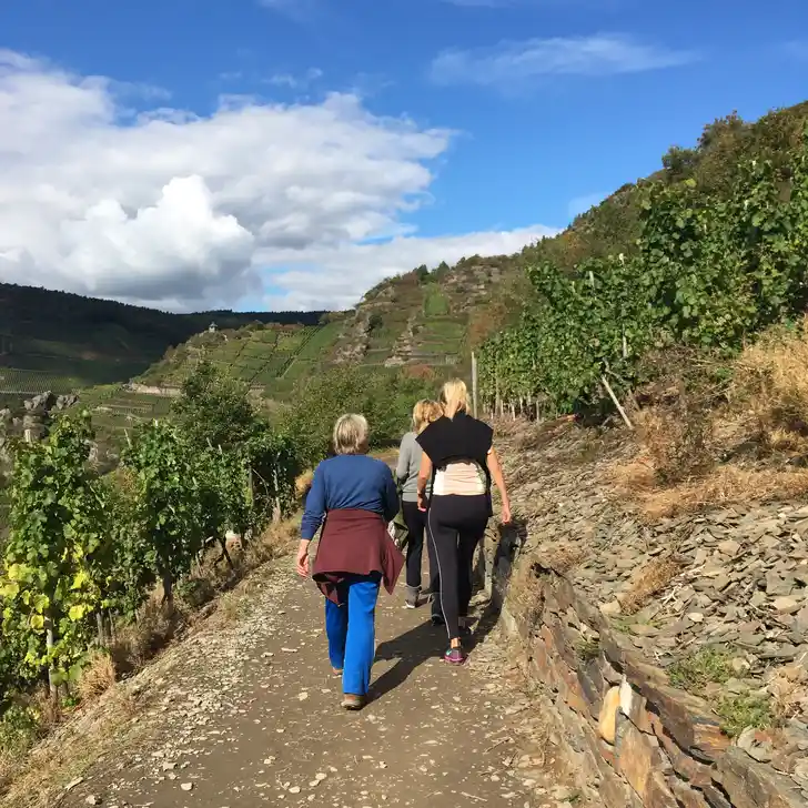 Hohenzollern ligt aan de RotWeinWanderWeg, een 40 kilometer lange slingerende weg tussen de wijnranken door. Mooi, maar soms een beetje toeristisch. Zeker in september/oktober als er wijnfeesten zijn. Een goed alternatief is dan Der Ahrsteig. Vanuit Hohenzollern daal je af naar het plaatsje Walporzheim. Van daaruit volg je de bordjes. 17 kilometer klimmen (het heet niet voor niets ahrsteig!) en dalen richting Bad Neuenahr.