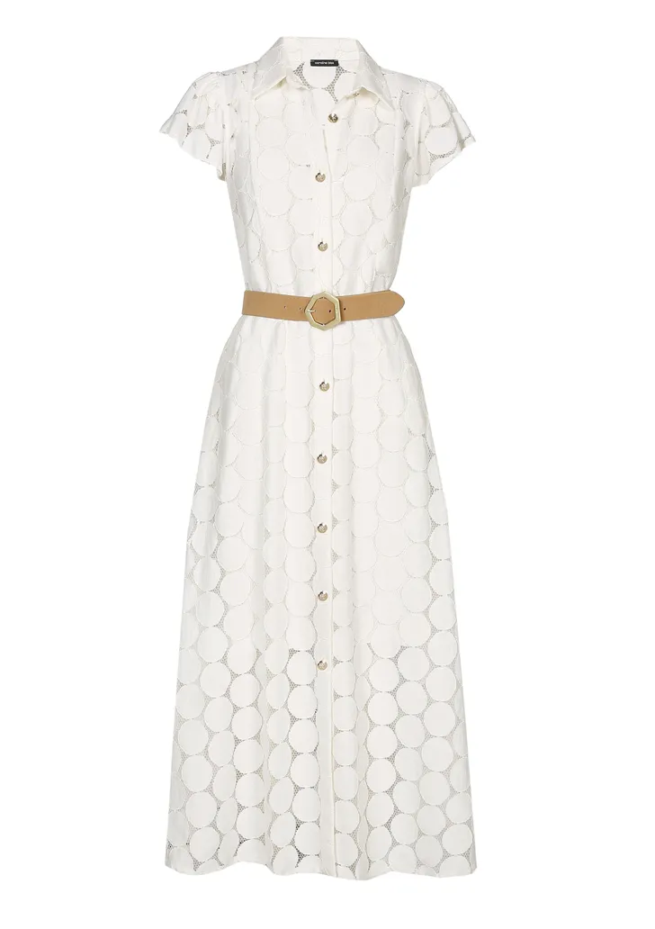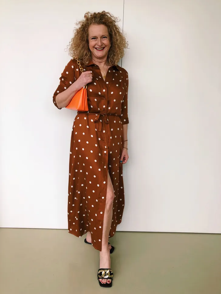 De jurk die ik hier draag (heel 'Pretty Woman' bij de polowedstrijd, maar dan met een sexy split) is een lange doorknoopjurk met stippen van Elements of Freedom € 189