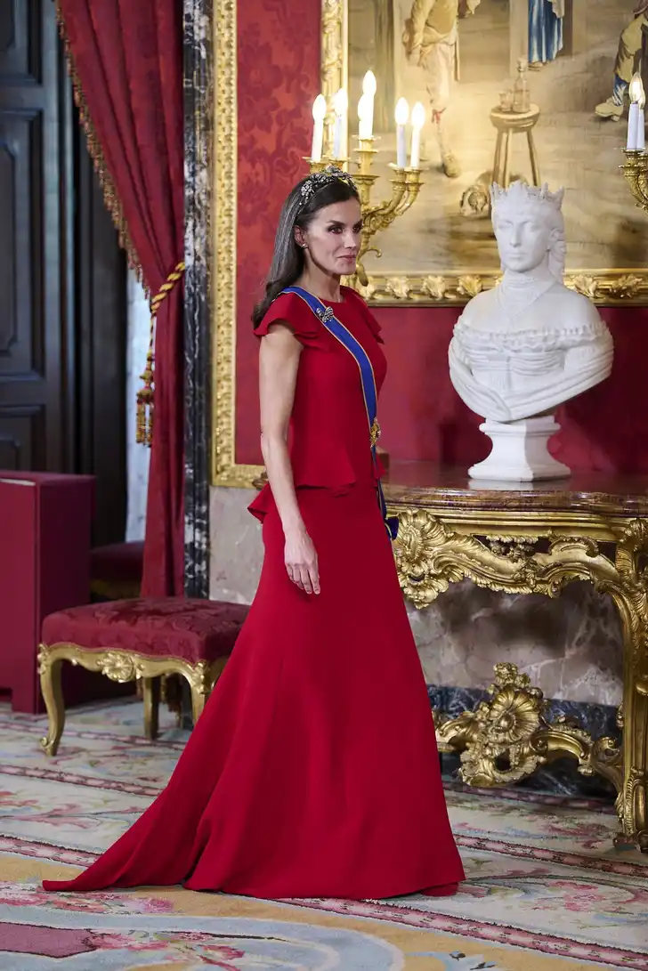 Koningin Letizia mocht deze week eveneens uitpakken met een avondjurk en juwelen. In het Koninklijk Paleis in Madrid prikte ze een vorkje met de president van Colombia en zijn vrouw. Haar rode jurk met schootje en vergelijkbare volants bij de mouwen is nieuw en werd bekroond door een diamanten bloemdiadeem.