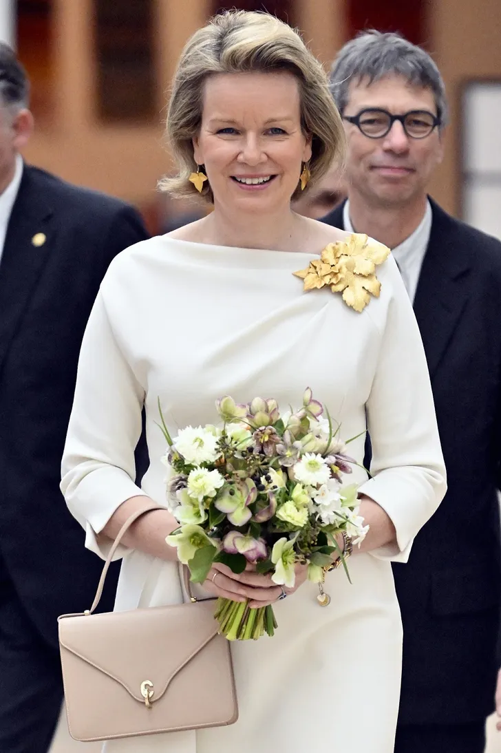 Over twinnen gesproken… Mathilde bezocht 31 maart de tentoonstelling Expeditie Egypte in het Koninklijk Museum voor Kunst en Geschiedenis (KMKG) in Brussel. Op haar witte japon prijkten een stuk of vijf moderne bladbroches.