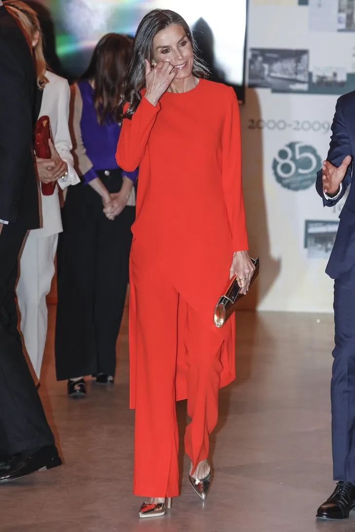 Letizia van Spanje bracht met haar kleding wat meer leven in de brouwerij. Oké, haar outfit was óók rood en óók met pantalon, maar door de asymmetrische lengte van de top gebeurde er tenminste wel wat. Voor dit effect hoefde ze absoluut geen fortuin neer te leggen, want zowel de top als pantalon komen uit een eerdere collectie van Zara.
