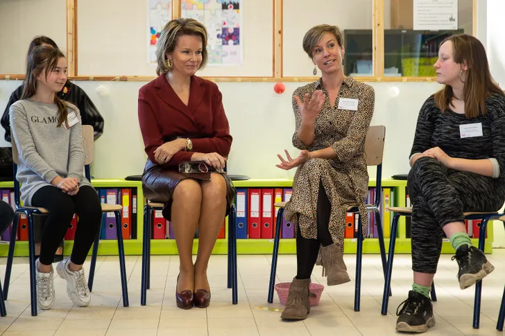 Wie de rok van Natan ook in haar kast heeft hangen, is koningin Mathilde van België. Zij droeg er in februari 2020 een top met reverskraag en flinke plateauzolen bij.