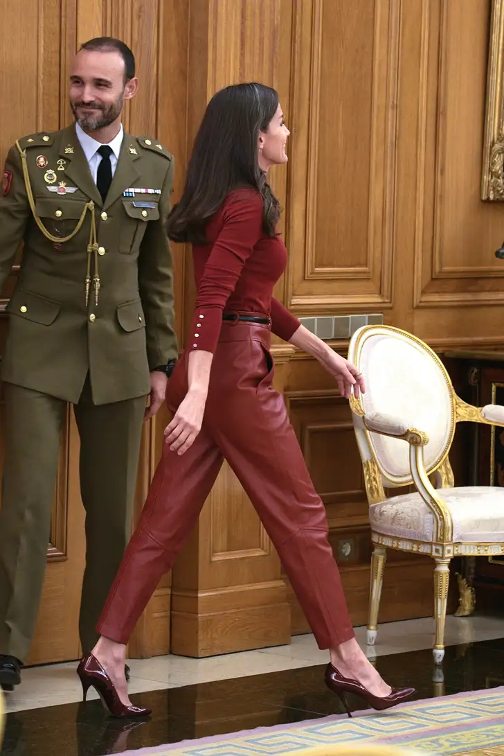 Prinses Aimée, een van de meest stijlvolle dames van de koninklijke familie, koos op haar beurt voor een leren top met goudkleurig borduurwerk. Een ontwerp van de Spaanse confectieketen Uterqüe.