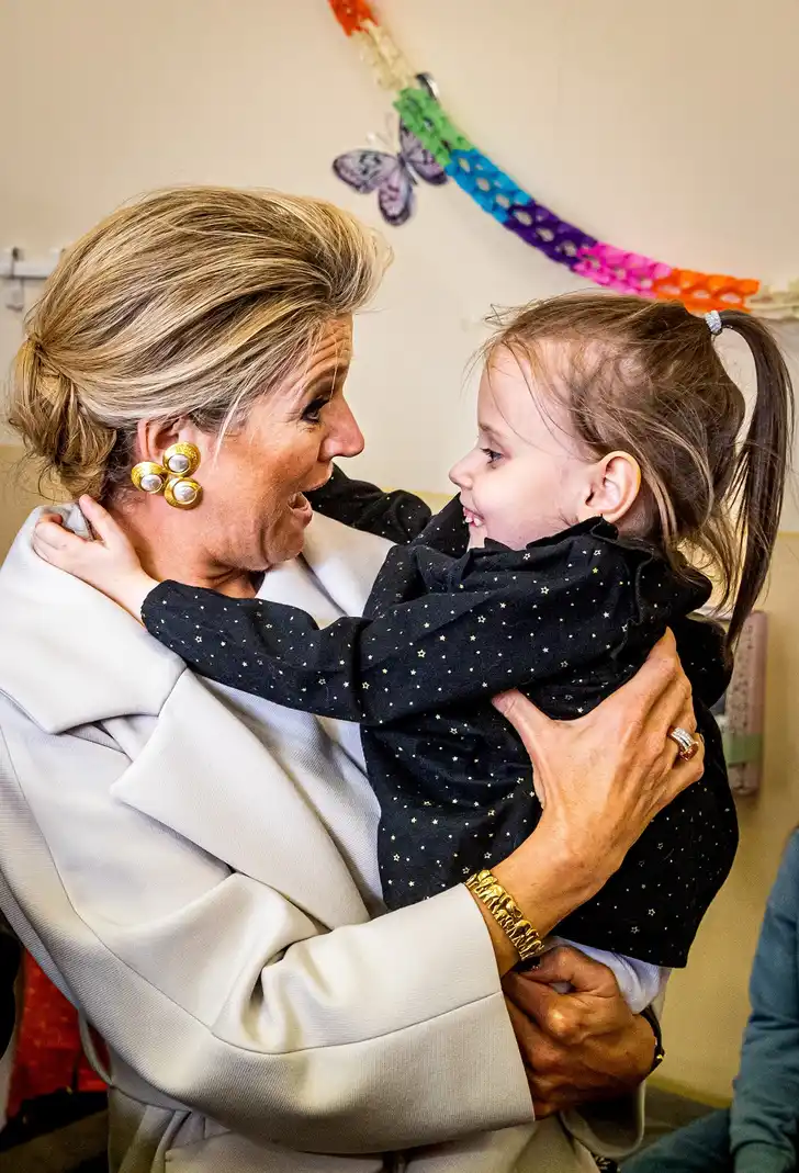 Op de laatste dag van een staatsbezoek draagt Máxima doorgaans wel een hoed, maar vanmorgen ontbrak het accessoire toen ze samen met de koning een opvangcentrum voor Oekraïense vluchtelingen in Slowakije bezocht. Maar goed ook, want ze kreeg een dikke knuffel van een van de kinderen.