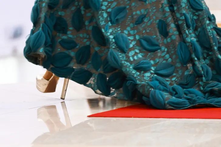 Onder de jurk droeg de koningin zilverkleurige peeptoes van Aquazzura. Door de hak van maar liefst 13 centimeter en de dikke plateauzool zijn dit zonder twijfel Máxima’s spannendste schoenen.