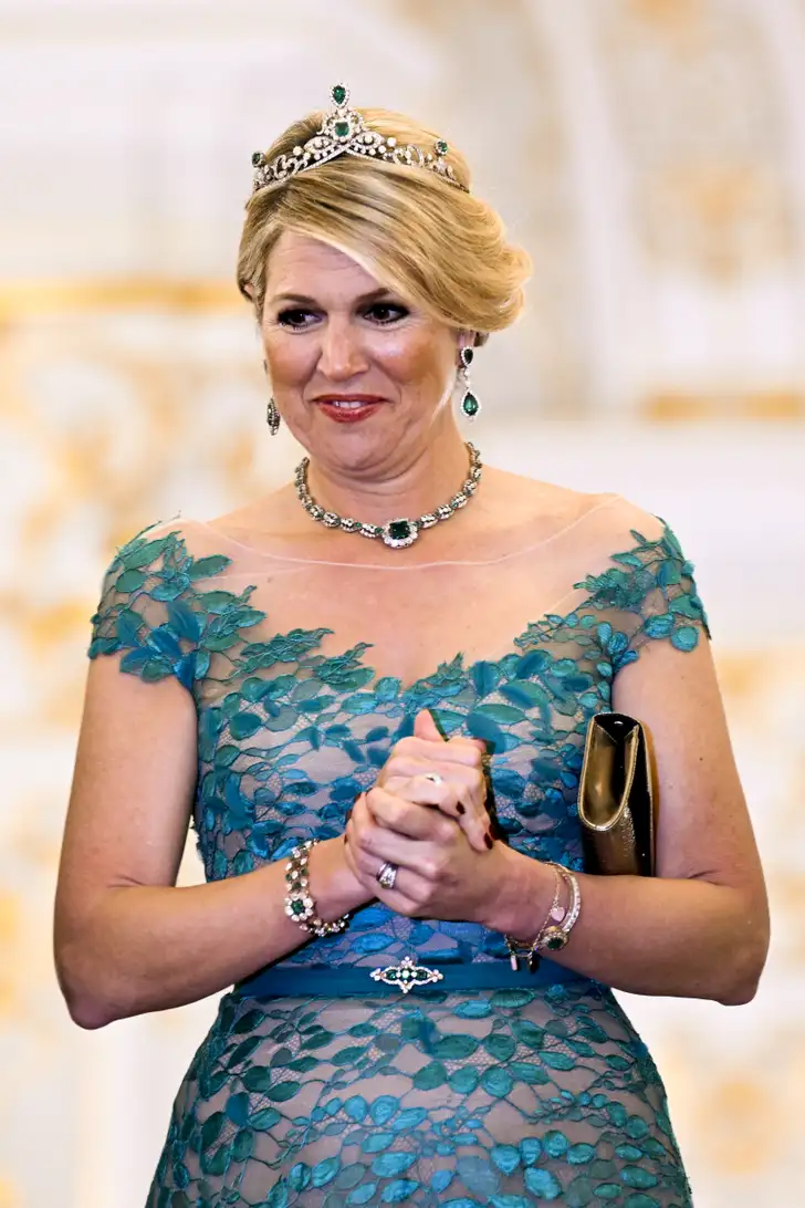 Naast een diadeem van smaragd en diamant droeg de koningin die avond ook een onbekende broche uit de koninklijke kluis. Het juweel dook - voor zover we nu weten - voor het eerst op bij koningin Wilhelmina in 1938. Prinses Irene werd er in de jaren 60 ook mee gezien, maar vervolgens verdween de broche decennialang buiten beeld. Het was Máxima die hem in 2007 herintroduceerde tijdens een gala in Noorwegen. Helaas ontbraken scherpe beelden, waardoor het juweel nu pas écht aan de wereld getoond is. Wat mij betreft smaakt dit naar meer!