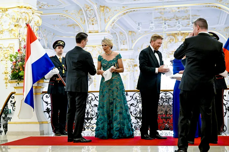 Bij aankomst droeg de koningin een nieuwe jurk van Natan, die werd omlijst met juwelen van saffier en diamant. De broche, die een fortuin waard is, bleef gelukkig goed zitten. Van de saffieren die aan de oorbellen hingen kan dat helaas niet gezegd worden. Máxima verloor ze niet, maar dat scheelde slechts één haakje.