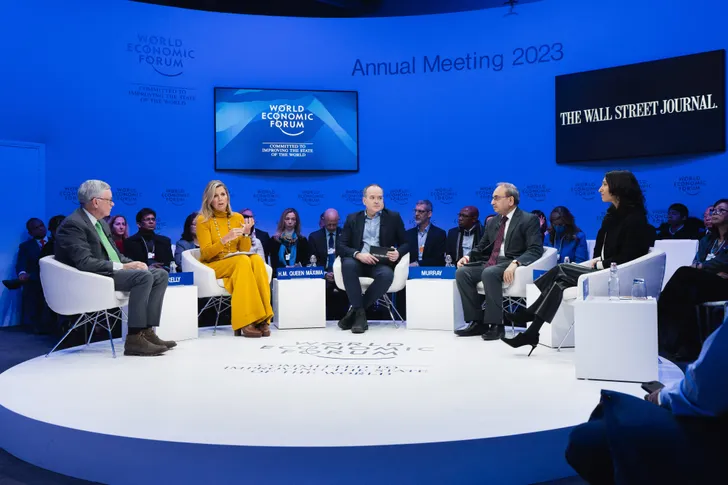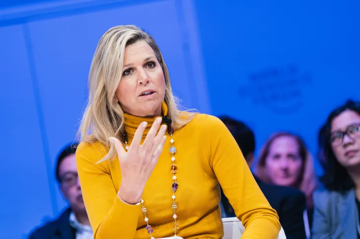 In Davos ging de kleurenparade vrolijk door, want op het podium van het World Economic Forum droeg de koningin een felgele set van Max Mara. Wat een geniale keuze! In de zee van donkere maatpakken kon niemand om haar heen.