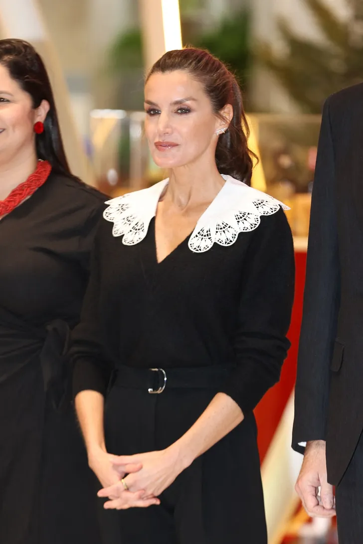 Bij witte kragen denk ik gelijk aan prinses Diana, maar koningin Letizia doet hard haar best om deze associatie te kapen.