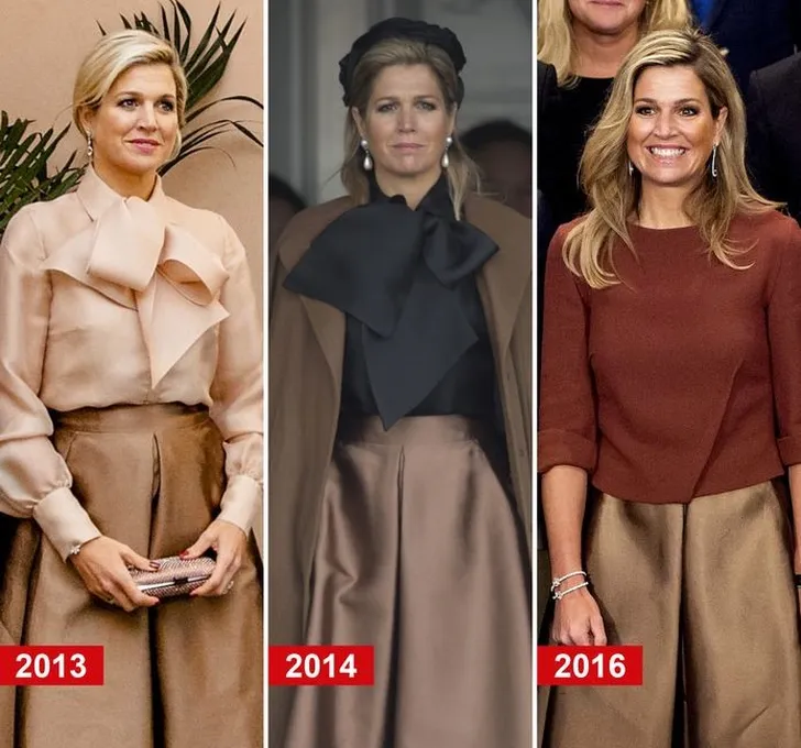 De roestbruine rok die onder Máxima’s cape schuilgaat, hangt alweer tien jaar in haar garderobe. Het kledingstuk laat zich uitstekend combineren, dus als ze dezelfde maat weet te behouden, zal het ontwerp van Natan over tien, twintig jaar nog steeds opduiken.