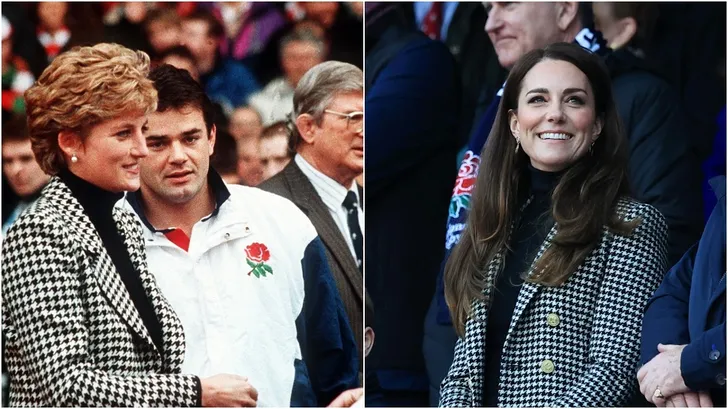 En als we het dan toch over Diana’s modieuze nalatenschap hebben… Ook Kate bracht haar deze week in herinnering. Tijdens de rugbywedstrijd Engeland – Wales droeg de hertogin van Cambridge een zwart-wit jasje met pied-de-poule-motief. Op het eerste gezicht geen heel bijzondere kledingkeuze, tot ik te horen kreeg dat prinses Diana in 1995 dezelfde keuze maakte voor exact dezelfde gelegenheid. Mooi hè?