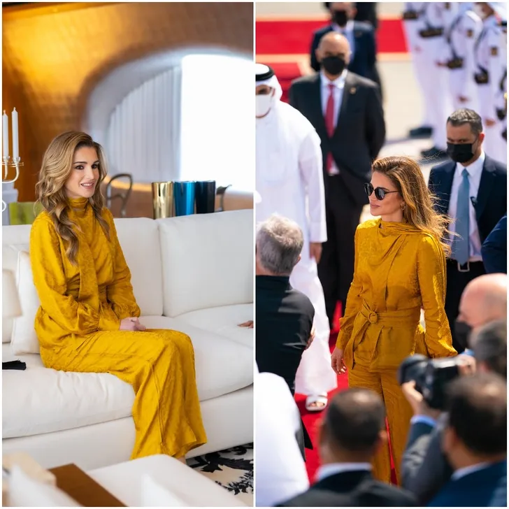 Rania van Jordanië hulde zich van top tot teen in het okergeel.