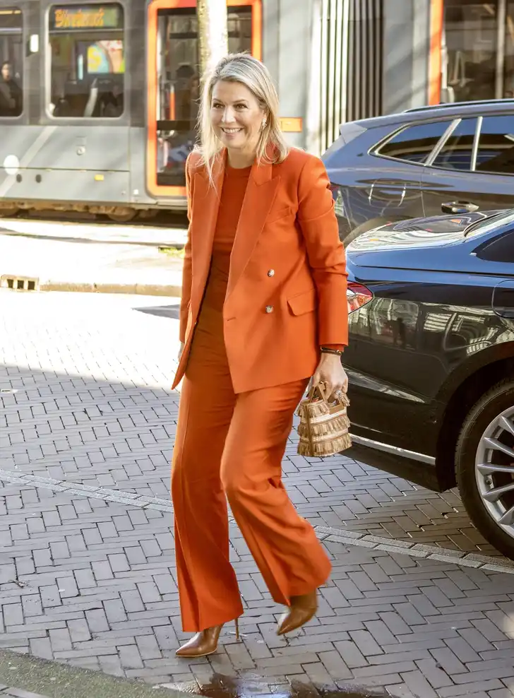 Sinds de inhuldiging heeft Máxima veertien broekpakken aangeschaft. Drie daarvan zijn oranje, dus ze doet haar naam eer aan. Het pak dat gisteren opdook kenden we nog niet en komt uit de huidige collectie van Joseph. Het geinige tasje met franjes is eveneens nieuw en komt uit de koker van de Griekse designer Marina Raphaël.