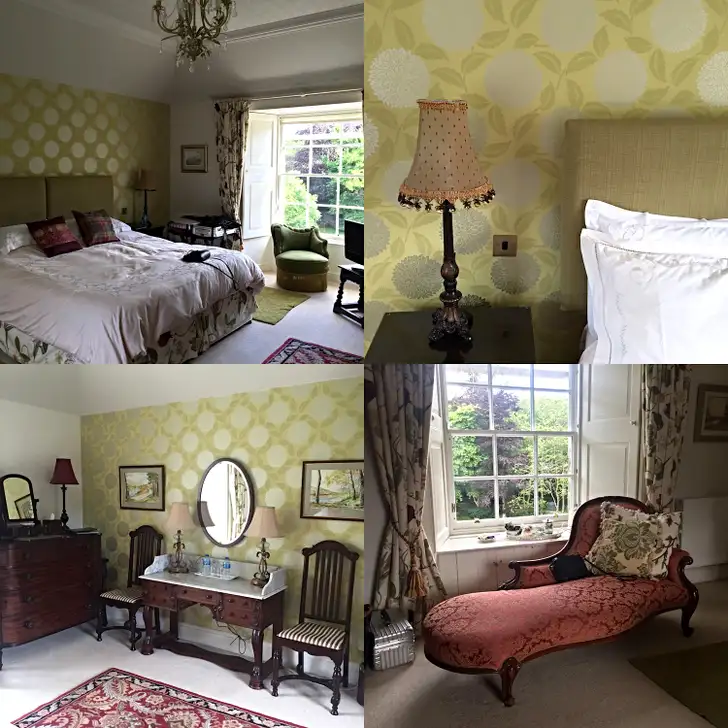 Het is prachtig gedaan, denk mooie dikke stoffen, design behang, originele meubelstukken en veel antiek. Elke slaapkamer is anders. Wij verbleven in Room Botanical, weer met uitzicht op de grote tuin. Een ruime kamer met groot bed dat gedekt is met superzacht Egyptisch katoen beddengoed afgezet met kant. Kom daar thuis maar es om. Natuurlijk met koffie- en thee dienblad (het blijft Engeland, hè?). Ik was meteen verliefd op de Downton Abbey style divan.