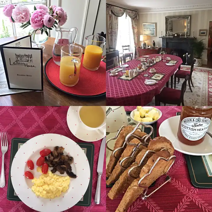 Er staat een ruime selectie op tafel met mooie Schotse producten afgewisseld met huisgemaakte marmelades, fruitsalades en natuurlijk vers geraapte eitjes uit eigen ren.
