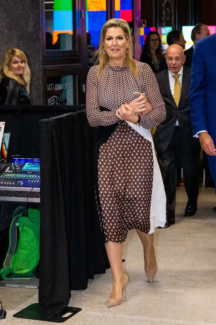 Bij de lancering van een financiële coalitie droeg Máxima dinsdagmorgen een bekende jurk met stippen en een accent bij haar taille.