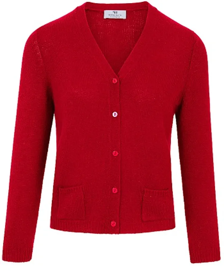 Op de foto draag ik een rode kantoenen broek van Arket en een rood cashmere trui met korte mouw van Peter Hahn.