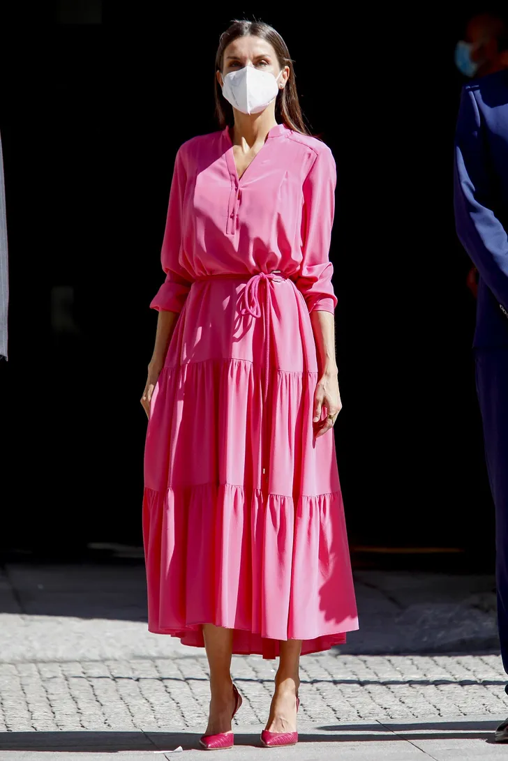 ...droeg de Spaanse koningin een heerlijke, zuurstokroze maxi-jurk van Hugo Boss. Om het maar met Audrey Hepburn te zeggen: I believe in pink.