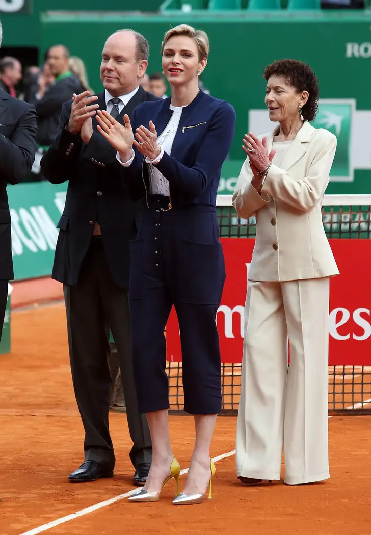Charlene let streng op de dosering van volume. Heel wijd is haar culotte dus niet, maar een geslaagde look is het zeker. Haar gele pumps dragen daar natuurlijk ook aan bij.