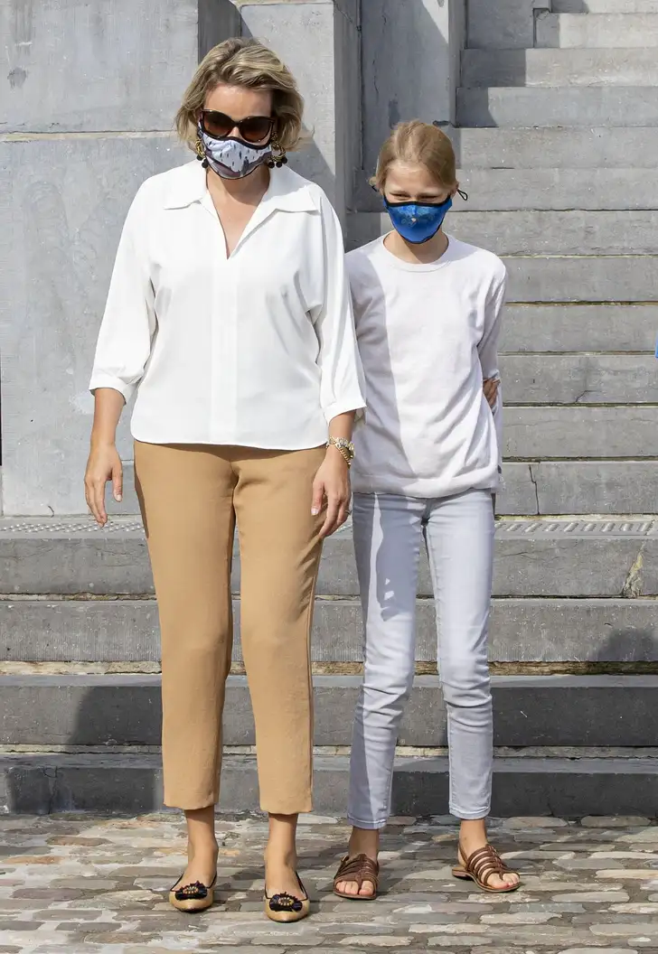 Vanuit de verte lijkt koningin Mathilde wel het modezusje van Kate te zijn, maar door de verschillende stoffen en accenten heeft haar look wel een heel andere uitstraling. Wat netter, wat saaier, maar haar mondkapje met Belgische kunst brengt gelukkig toch nog wat leven in de brouwerij.