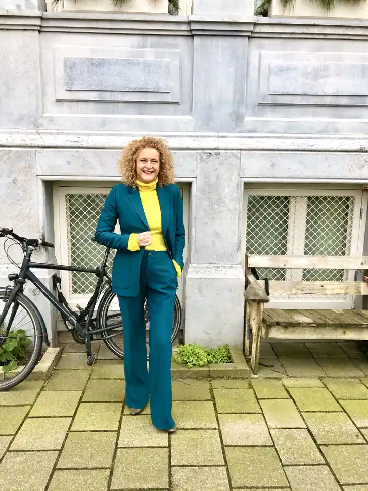 Mijn favoriete kleurcombinatie is felgeel met petrol. Op de foto draag ik een petrol kleurig pak van La Dress gecombineerd met een gele trui van Cos (oude collectie).