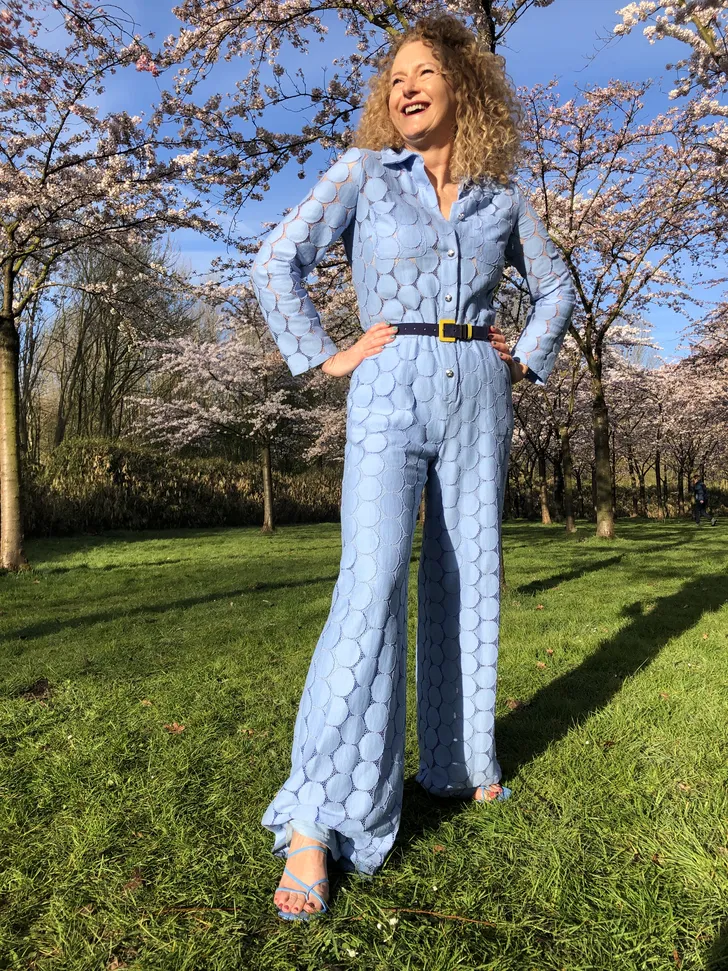 Op de foto draag ik een kanten jumpsuit met wijde pijpen Caroline Bis € 240