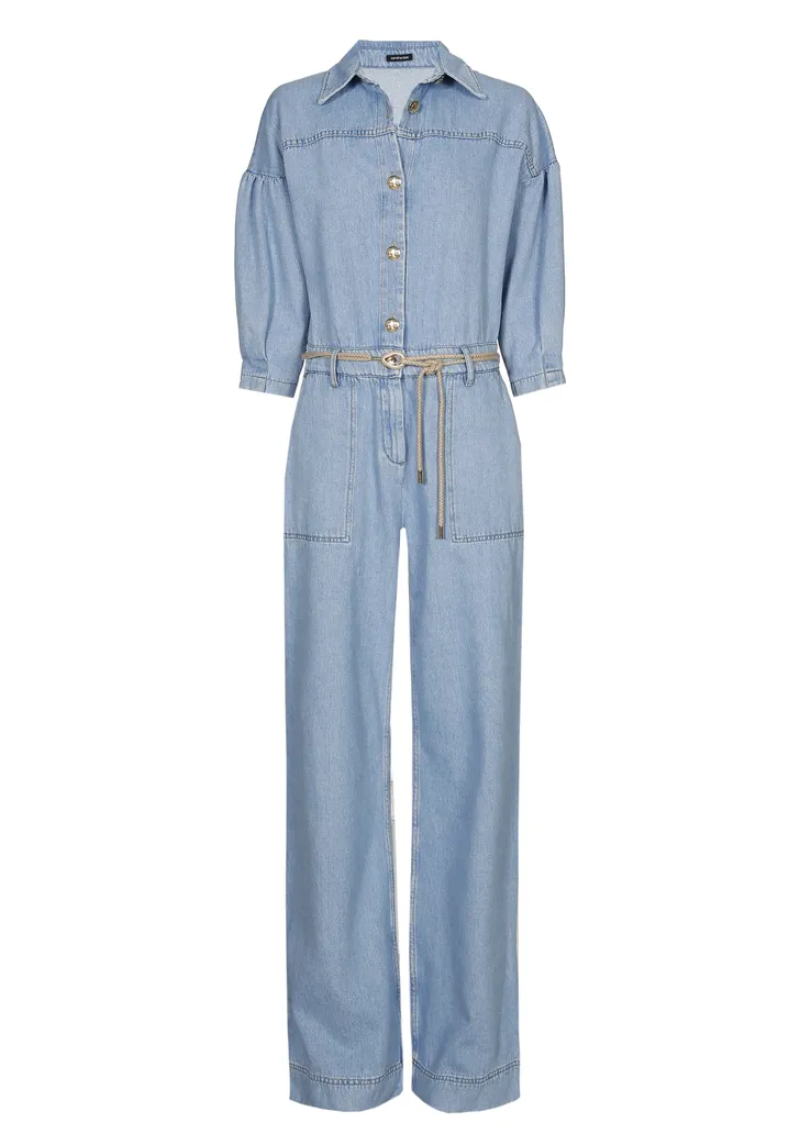 Van Chanel tot Dolce & Gabbana, bijna alle ontwerpers hebben dit seizoen jeans verwerkt in hun collectie. De denim van dit seizoen is zacht en licht van kleur. Deze jumpsuit is een tikje seventies dankzij het koord in de taille.