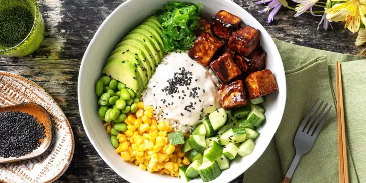 In onze maaltijden combineren we ze graag zodat elk gerecht minimaal 20 gram eiwitten uit verschillende producten bevat. Gebakken tofu, zeewiersalade en avocado zijn bijvoorbeeld drie eiwitbronnen in deze sushibowl.”
