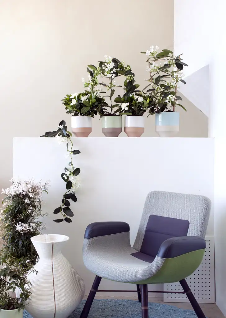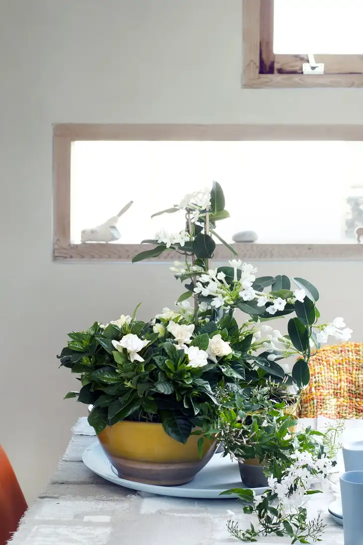 Nog zo'n geurfeestje is Gardenia, een chique bloeiende plant met glanzende donkergroene blaadjes en prachtig wolkende bloemen. De geur is een tikje oriëntaals, zoetig en troostend. En de knoppen zijn schitterend: net schelpen die open gaan in zachte, fluweelachtige rozetten, alsof een danseres met haar mooiste rok aan een pirouette maakt. Een woonplant met een enorm 'Downton Abbey' gehalte, voor als je houdt van romantisch en geraffineerd. Hier ook op de foto te zien: Stephanotis en Jasmijn.