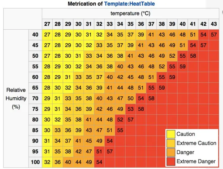 De gevoelstemperatuur ligt dan zo'n tien graden boven de daadwerkelijke temperatuur: bij een vochtigheidsgraad van 75% voelt 32 graden dus als 42 graden.