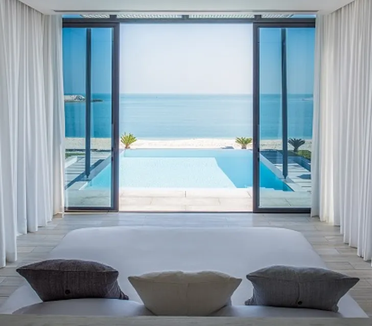 De moderne villa's hebben elk een eigen zwembad en uitzicht op de Arabische Zee. Als je met z'n vieren in zo'n topvilla logeert, is de prijs nog het overwegen waard.