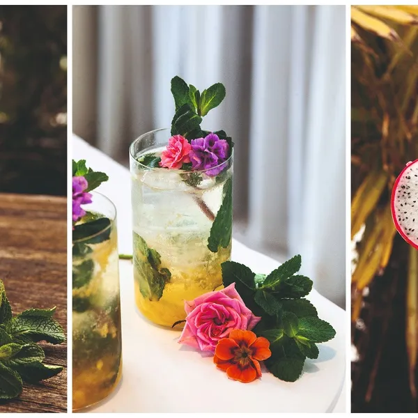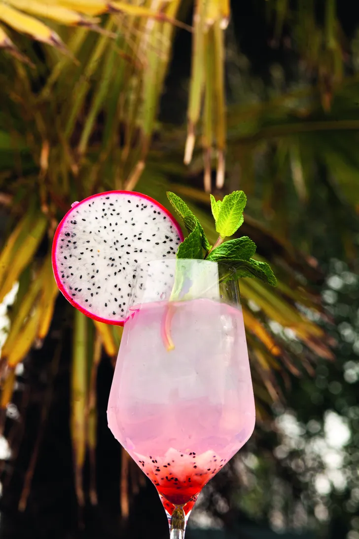 5 Garneer de mocktail met het takje munt en een schijfje pitaja.