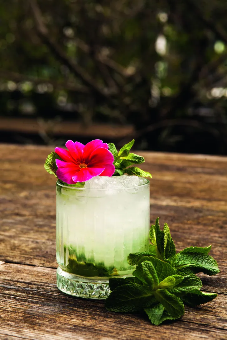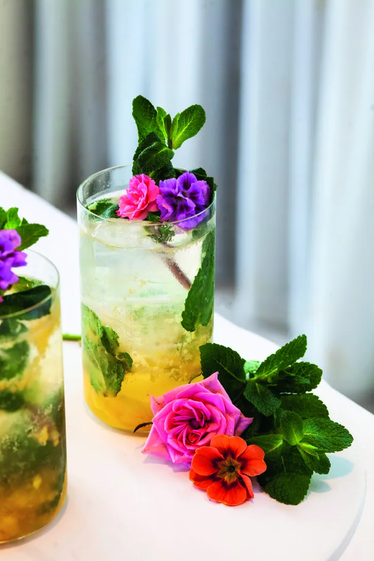 8 Garneer de mocktail met het takje munt en leg de eetbare bloemen op het takje munt.
