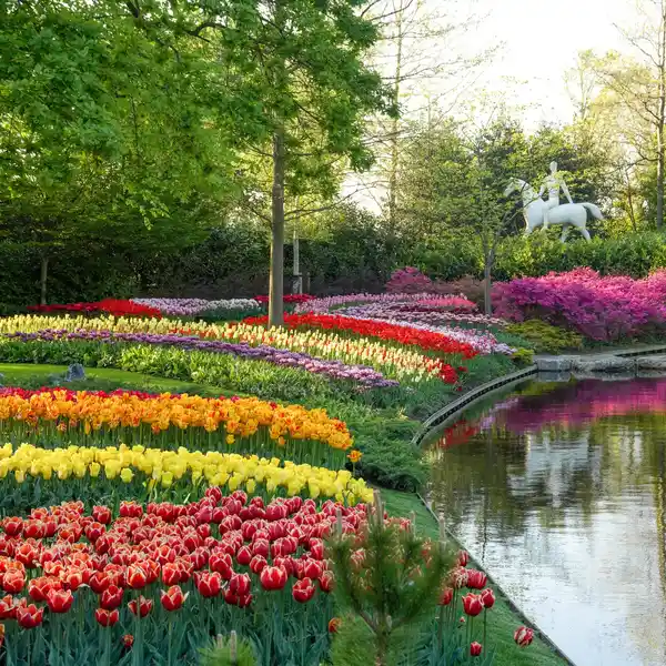 Op de kleurrijke bloemenvelden rondom de lentetuin kun je prachtige bloeiende voorjaarsbloemen zien zoals krokussen, narcissen, tulpen en hyacinten. De 15 kilometer wandelpaden van de Keukenhof zijn zo aangelegd dat je een spectaculair uitzicht hebt op de heerlijk geurende bloementuinen en bloemenkassen.