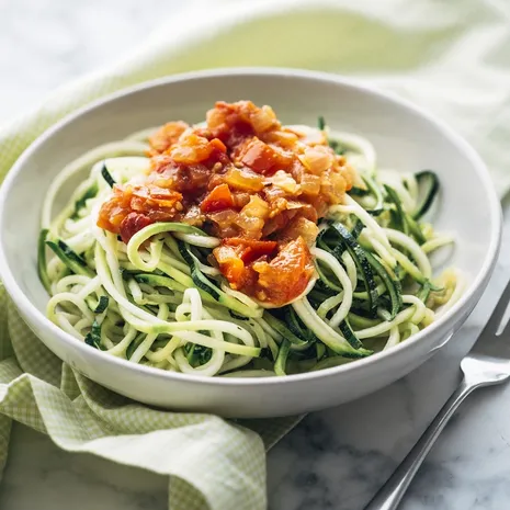 Het gezondste alternatief is courghetti, waarbij je met een spiralizer sliertjes maakt van een stevige courgette.