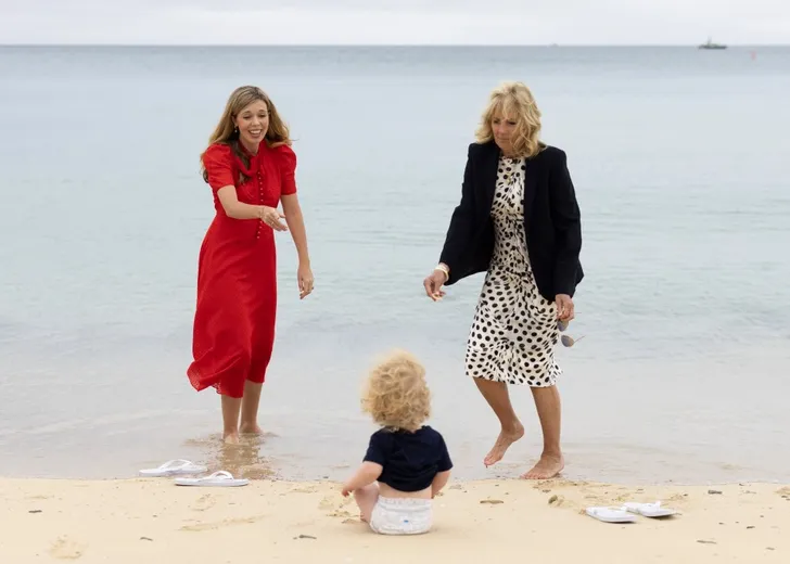 ... en met Carrie dus Wilf (hier eerder dit jaar met First Lady Jill Biden in Cornwall) en de aanstaande Baby Johnson. Boris weigert stelselmatig te zeggen hoeveel kinderen hij in totaal heeft, in Londen gaat het hardnekkige gerucht dat hij nog een nazaat bij een eerdere minnares heeft. De man heeft er nogal wat affaires op nagehouden.