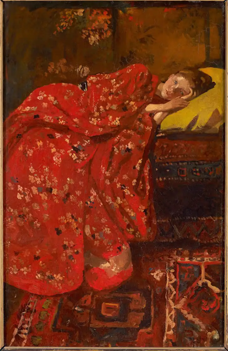 Geesje Kwak poseerde afwisselend in een rode, witte en blauwe Japanse kimono. Vanaf zijn verblijf in Parijs in 1884, waar het Japonisme het modebeeld beheerste, was Breitner gefascineerd door de Japanse kunst. Ook in Nederland werden in die jaren Japanse avonden gehouden en Japanse prenten tentoongesteld. Breitner verzamelde deze houtsneden ook zelf.