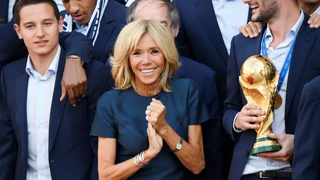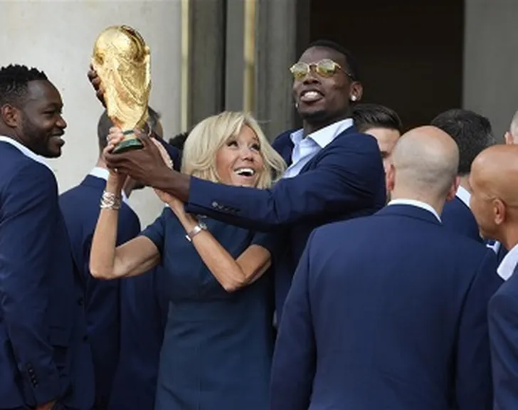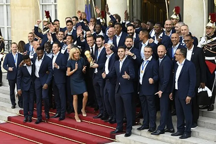 Gisteren werd het Franse voetbalelftal gehuldigd in Parijs. Daar hoorde natuurlijk ook een bezoek bij aan het presidentieel paar. De Fransen worden ook wel Les Bleus genoemd (De Blauwen) dus stak iedereen zich in het blauw. En Brigitte Macron natuurlijk ook.