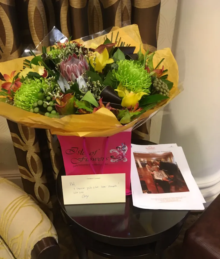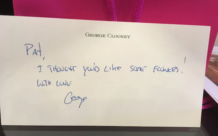En zoals het hoort op een verjaardag, kwam gentleman George niet met lege handen. Hij had voor Pat een mooie bos bloemen meegenomen en gaf haar een handgeschreven kaart. Uiteraard werden de twee ook vastgelegd op camera.