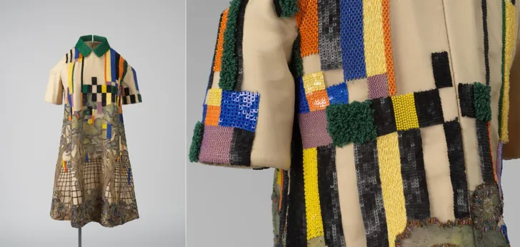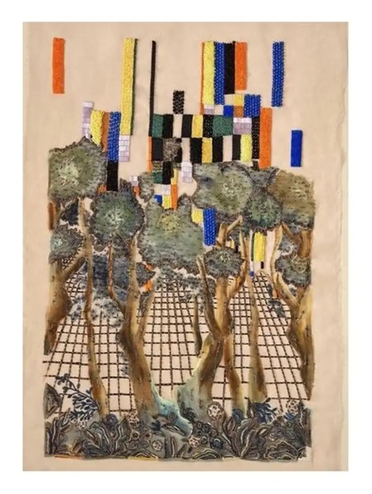De voorstelling bestaat uit bomen die verwijzen naar oude gobelins en kleurvlakken die refereren aan het modernisme van Bauhaus. Zij worden samengebracht in een geometrisch grid. Dit beeld is een vervolg op de research die Taminiau deed voor zijn collectie 'Robotic Nature' in 2016. Dit is een cocktailjurk uit die vermaarde collectie, die inmiddels in het Centraal Museum Utrecht hangt.
