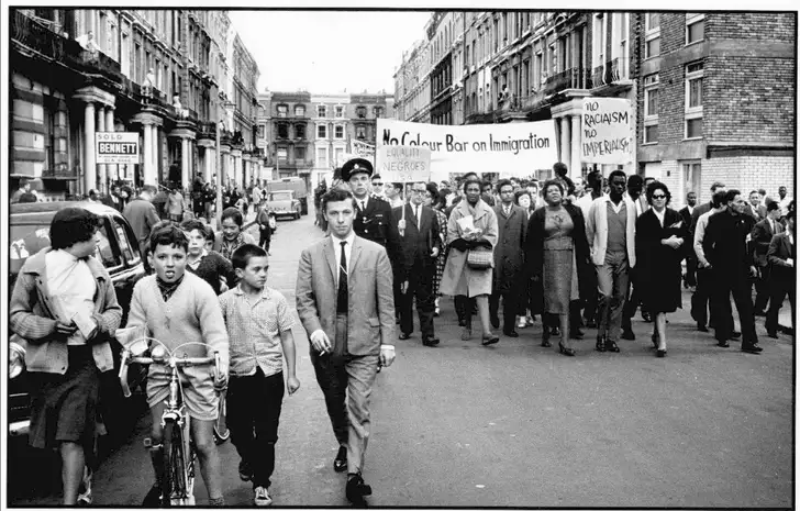 Notting Hill Residents March Against Racism, London, ca. 1965' by John ‘Hoppy’ Hopkins: "Vijfenvijftig jaar laten discussiëren we nog altijd over dezelfde onderwerpen en zijn er nog steeds demonstraties," aldus Murray.