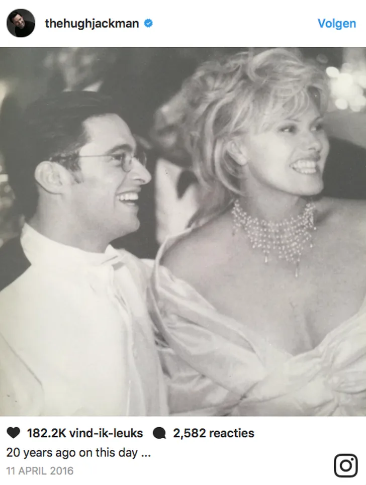 De twee zijn deze week 21 jaar getrouwd en dat heuglijke feit deelde Hugh gisteren met de wereld door een liefdevolle selfie van hem en zijn echtgenote te posten op Instagram. Hij plaatste daarbij de tekst: 'Voor mijn grote liefde. 21 geweldige jaren. Ik hou van jou met heel mijn hart.' Wat een geluksvogel, die Deborra-Lee. En hij net zo goed, want zij moet wel heel leuk zijn als je zo lang gek op elkaar blijft.