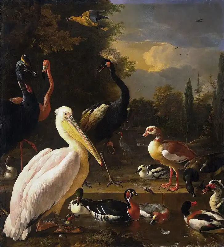 De allerrijksten in de 17e eeuw lieten exotische vogels als papegaaien, pelikanen en flamingo’s verschepen om er thuis hun ‘menagerie’ - een privé dierentuin - mee te vullen. Die vogels waren zeldzaam en daarmee een statussymbool. Zulk kostbaar, sterfelijk bezit, wilden ze vastleggen. Bij voorkeur door Melchior d’Hondecoeter, de beste vogelschilder van de Gouden Eeuw.