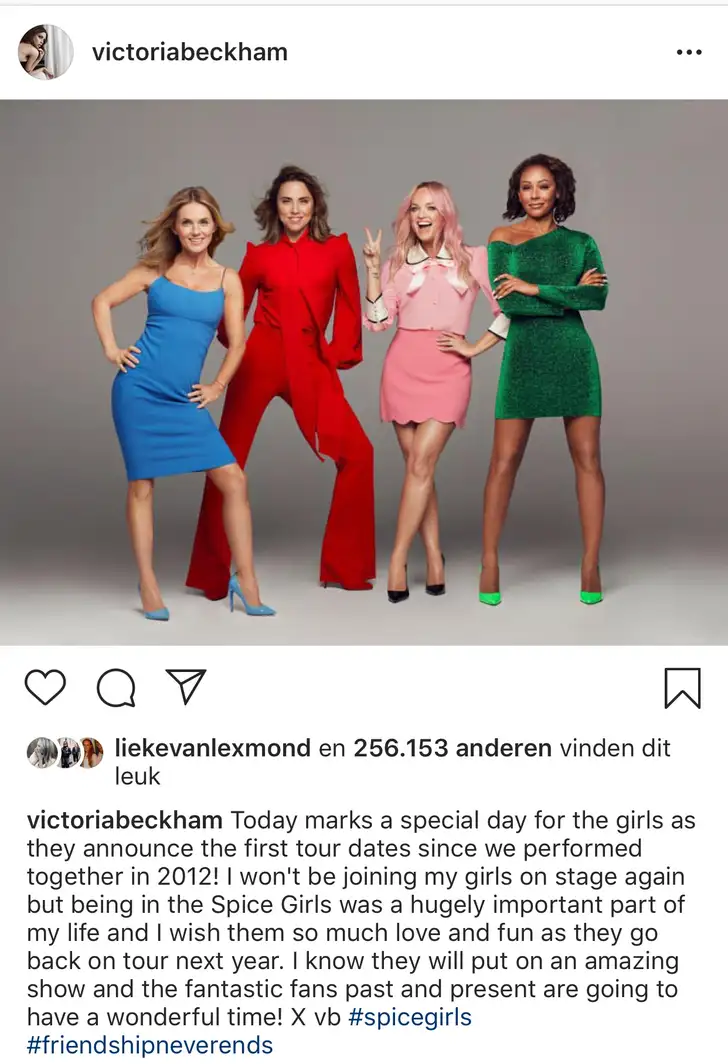 Vicoria Beckham (voorheen Posh Spice) toert niet mee, maar feliciteerde haar vriendinnen wel nadrukkelijk op Instagram.